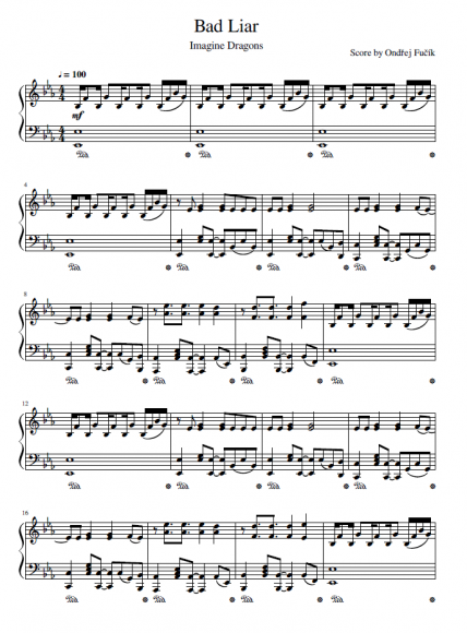 Nabízím autorskou klavírní aranži ke skladbě Bad Liar od skupiny Imagine Dragons. Audio nahrávku je možné si poslechnout zde: https://youtu.be/l79u8ns8hJU