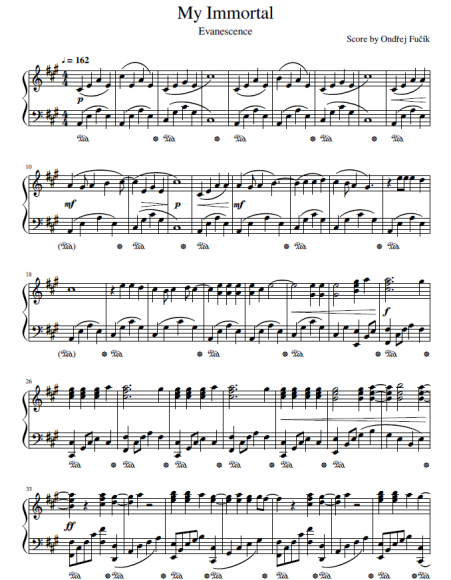 Nabízím autorskou klavírní aranži ke skladbě My Immortal od skupiny Evanescence. Audio nahrávku je možné si poslechnout zde: https://youtu.be/5z9vQgpCEus